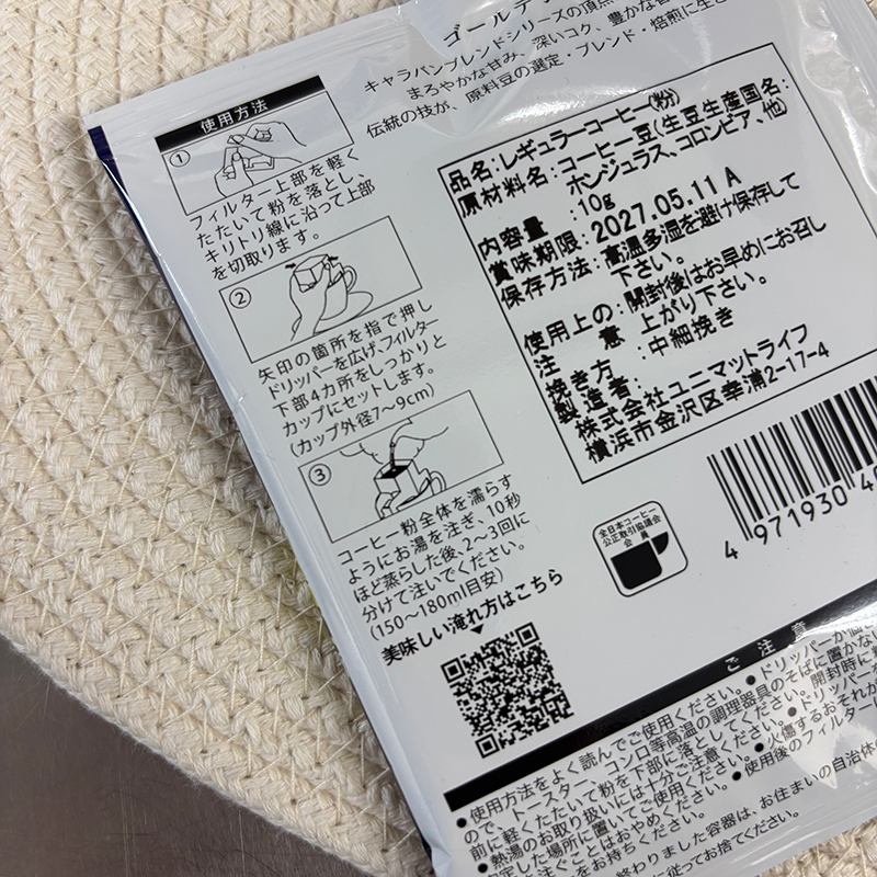 簡易抽出タイプのコーヒーには必ず裏面表示があります。そこには適正な抽出量が記載されていますので、最初はそれを基準に淹れてみましょう。