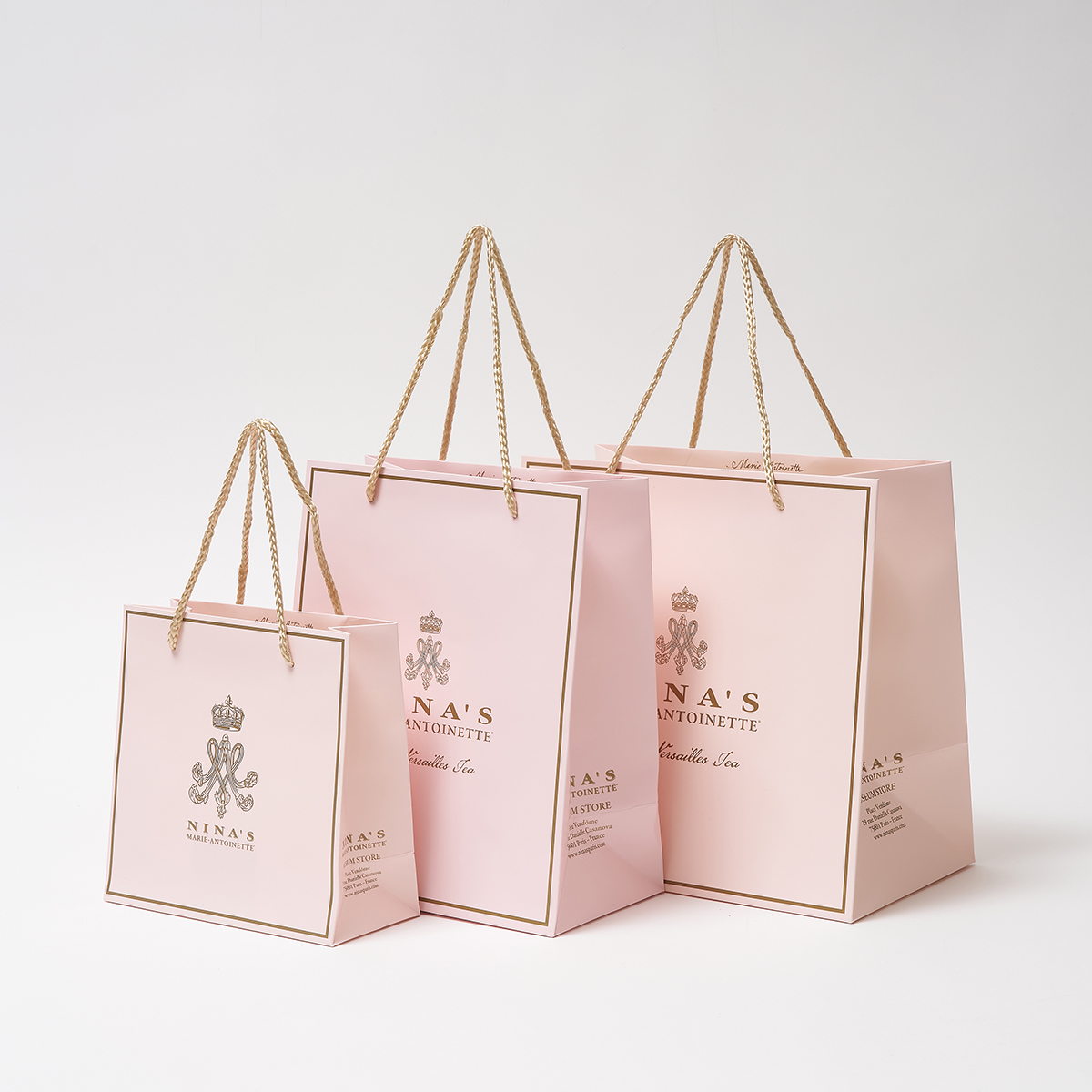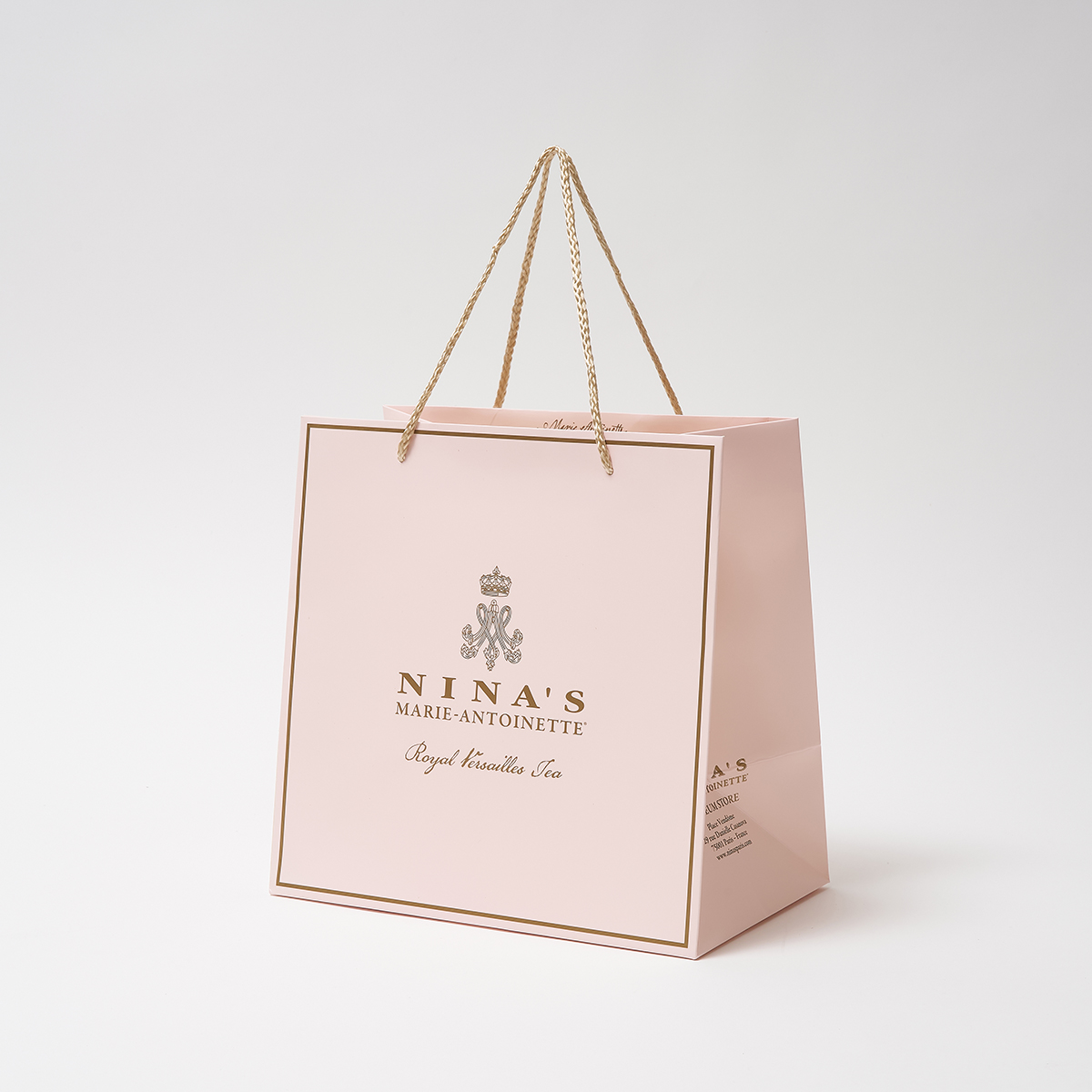 マットな素材を使用した高級感のあるニナス オリジナル紙袋です。 フランス生まれの紅茶「ニナス マリー・アントワネット」では、丹念に香りづけされた紅茶をお届けします。